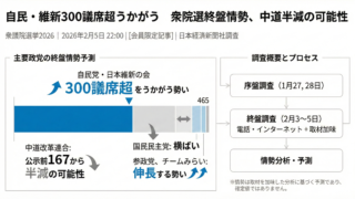 終盤情勢における最大の焦点となっている「自民党・日本維新の会による300議席超」という保守覇権シナリオの現実性と、それに対抗すべく結成された新党「中道改革連合(略称:中道)」が直面している「埋没と半減」の存亡の危機について、歴史的背景、選挙区ごとのミクロな力学、そしてマクロ経済環境の観点から包括的に分析する。